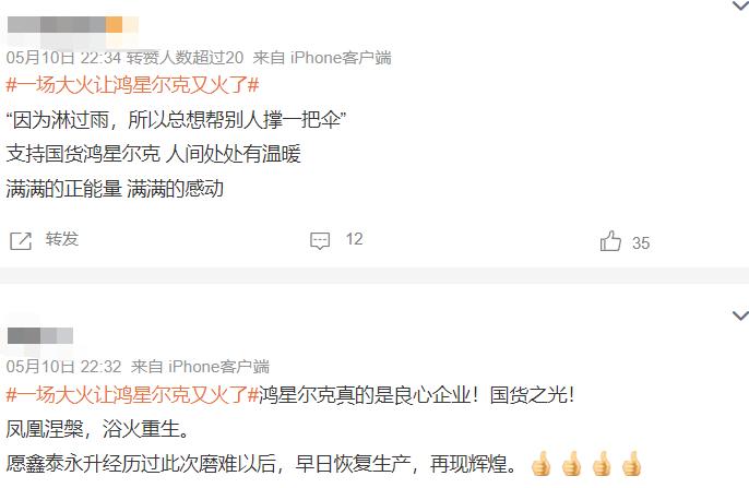 最近,一场大火又将鸿星尔克推上舆论高峰。4月底,鸿星尔克合作工厂鑫泰永升在当地火灾中受到波及,设备被损毁,产品也无法如期交付。品牌得知后,并未追究订单违约责任,而是第一时间协调人力物力救灾重建,帮助受灾工厂度过难关。消息一经报道,迅速引发了大范围讨论,并赢得了网友好评,诸如“国货之光”、“良心企业”等正面评价也让品牌声量再一次得到了提升。