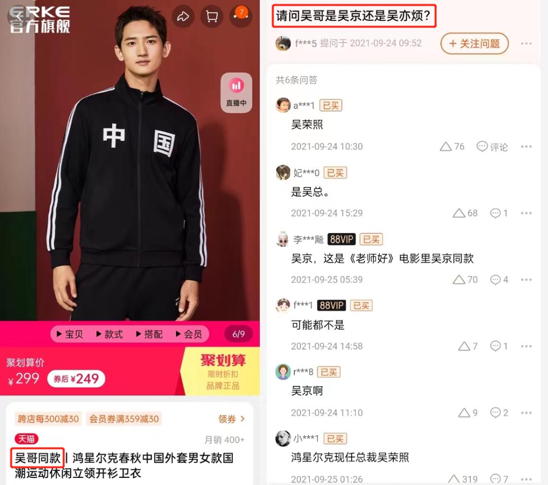 而在去年吴京同款“中国”外套爆火之际,鸿星尔克也趁势上新了“吴哥同款”外套,不过这个吴哥不是吴京,而是鸿星尔克的老板吴荣照,在淘宝店铺留言区,也因此引发了不少用户混淆。这波蹭热度的行为,不免有些“擦边球”之嫌。