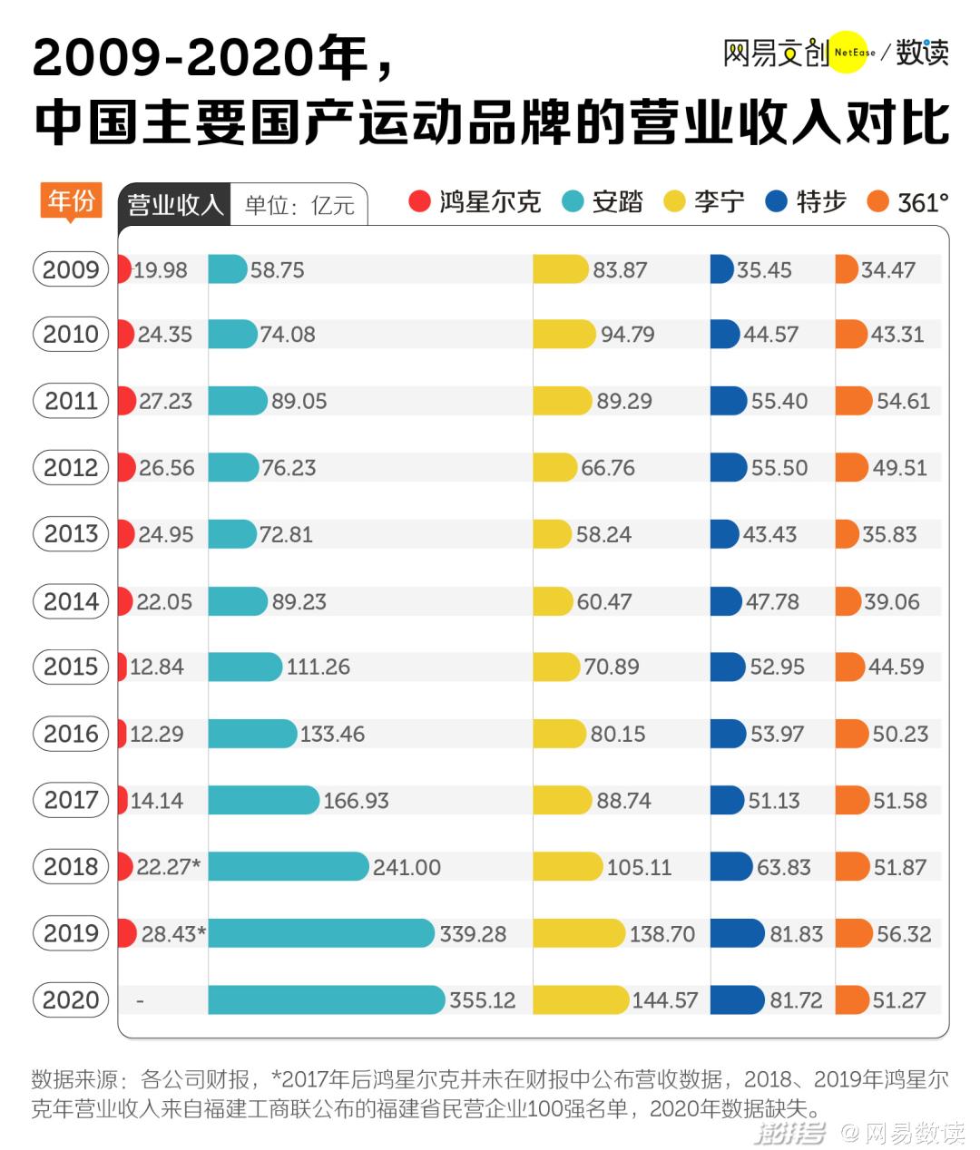2009-2020部分国产运动品牌营收对比/网易文创