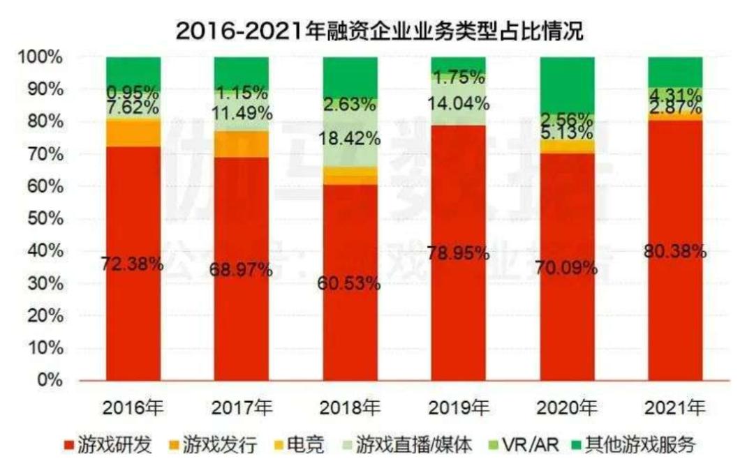 然而,过去五年近七成的游戏行业融资发生在游戏研发公司身上,其次是游戏发行、电竞、游戏直播/媒体平台,就连刚兴起不久的VR/AR硬件赛道都要比游戏手机更受资本青睐。