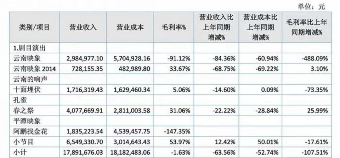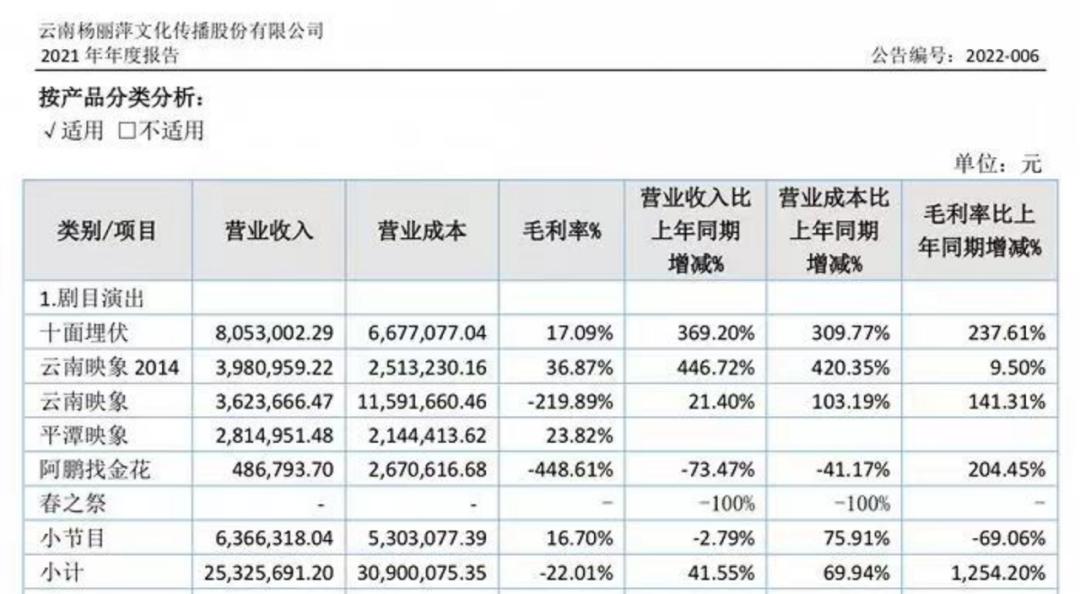 2014年,由杨丽萍持股的云南杨丽萍文化传播有限公司率先进入新三板,作为公司创始人,杨丽萍直接拥有的股份达到了云南文化的60%。云南文化股票一经上市,便受到资本热捧成为市场哄抢的对象。云南文化的主要收入来源依赖于《云南印象》和《孔雀》两部核心剧目,根据云南文化2020年和2021年的年度财务报告显示,疫情防控期间演出营业成本远高于收入,演出经济已成亏损状态。
