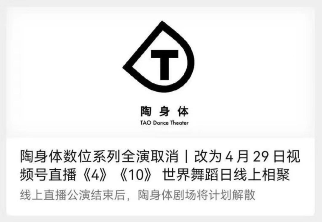同样面临成本压力的“陶身体”原计划4月29日至5月4日在国家大剧院台湖舞美艺术中心举办 的“陶身体数位系列全演身体艺术节”也宣布取消。陶身体不仅被台湾现代舞大师林怀民称赞,更登上《纽约时报》和《泰晤士报》称其团队重新定义了舞蹈,是具有中国美学传统的全新现代舞团。