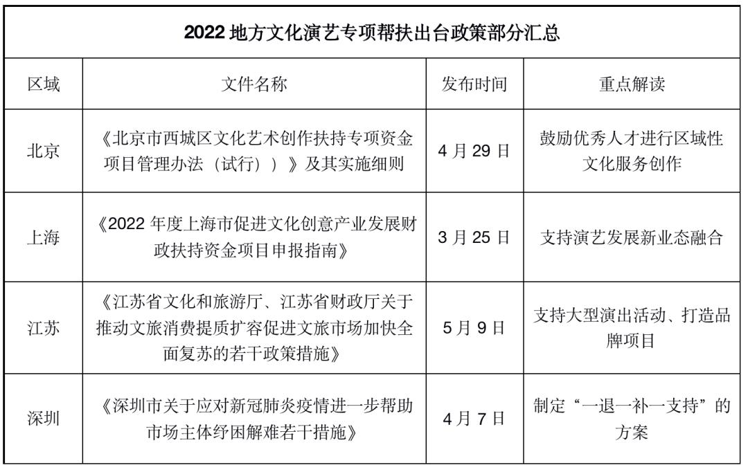 从地方政策来看,北京市发布了《北京市西城区文化艺术创作扶持专项资金项目管理办法(试行))》及其实施细则。该文件表示:优先鼓励青年创作者和艺术人才为区域文化进行服务性建设等。上海市今年出台的《2022年度上海市促进文化创意产业发展财政扶持资金项目申报指南》也表示:支持剧场演出、演艺新空间发展、多业态融合发展、民营院团发展。支持“五个新城、南北转型”重点项目和演艺票务机制实践。