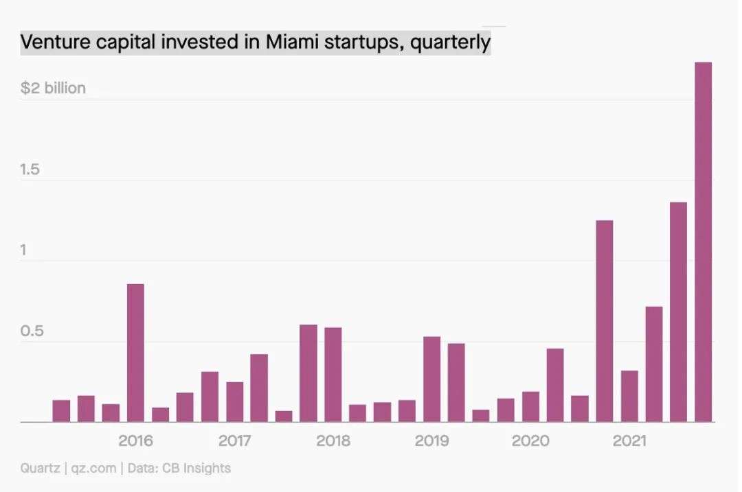 数据告诉我们,迈阿密的种种努力确实带来了回报。迈阿密的初创公司在2021 年共筹集了约30 亿美元,约是 2020 年三倍,特别是其加密领域风险投资从2020年的600万美元飙升至2021年的7.45亿美元,增长了100倍之多。