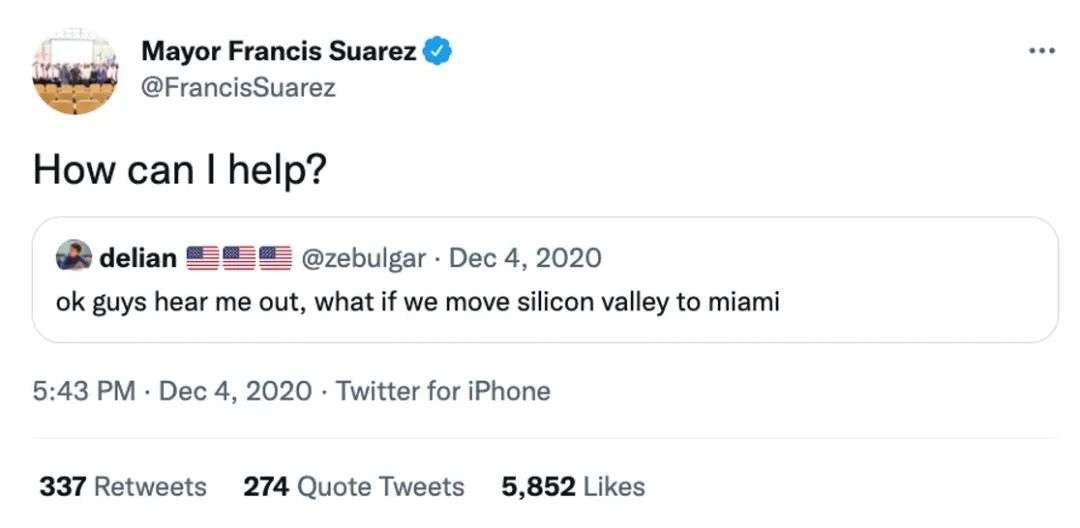 一年前,Francis Suarez在推特上回复的那句充满服务意识的“我能够怎么帮你?”收获了很多创业者的好感,吸引了越来越多的Web3公司选择在迈阿密扎根。