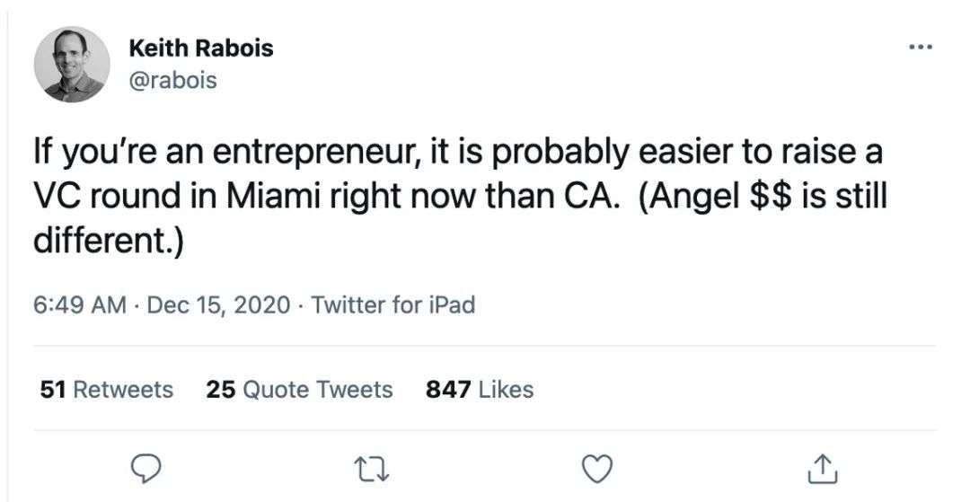 “因为硅谷现在的创业路径很理性规范,为了说服投资人你可能需要准备大量的项目材料,你的团队成员可能必须有名校背景,你需要过五关斩六将,提供足够的证据来证明你的能力。但在迈阿密,你可能就是在某一个聚会上向身边的人分享了你正在做的项目,而他刚好对你所做的领域感兴趣,于是就当即就给你投了。”