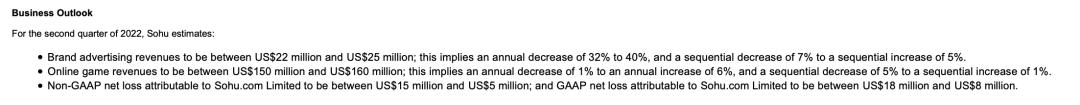 2022年第二季度,搜狐预计:品牌广告收入在2200万美元至2500万美元之间,较2021年同期下降32%至40%,较2022年第一季度下降7%至增长5%。