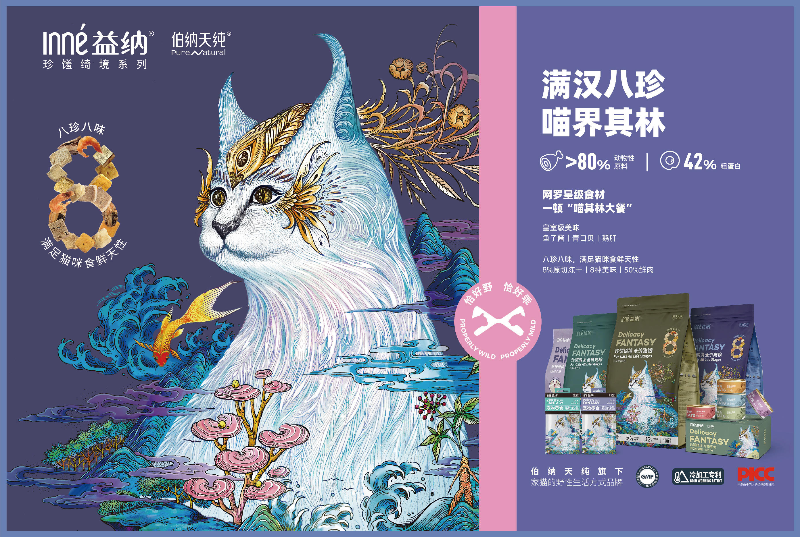 在洞察到了家养猫咪“野性”与“家养环境”的矛盾冲突之后,2021年伯纳天纯针对高端猫用户群特别推出了家猫的野性生活方式品牌“益纳”,专注于为家猫研发满足野性生活需求的高端产品。