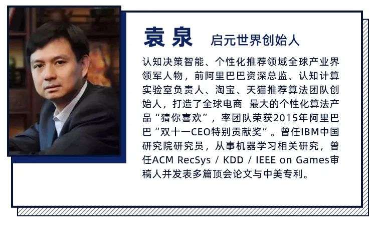 嘉宾介绍:袁泉,启元世界创始人,认知决策智能、个性化推荐领域全球产业界领军人物,前阿里巴巴资深总监、认知计算实验室负责人、淘宝、天猫推荐算法团队创始人,打造了全球电商 最大的个性化算法产品“猜你喜欢”,率团队荣获2015年阿里巴巴“双十一CEO特别贡献奖”。曾任IBM中国研究院研究员,从事机器学习相关研究,曾任ACM RecSys / KDD / IEEE on Games审稿人并发表多篇顶会论文与中美专利。