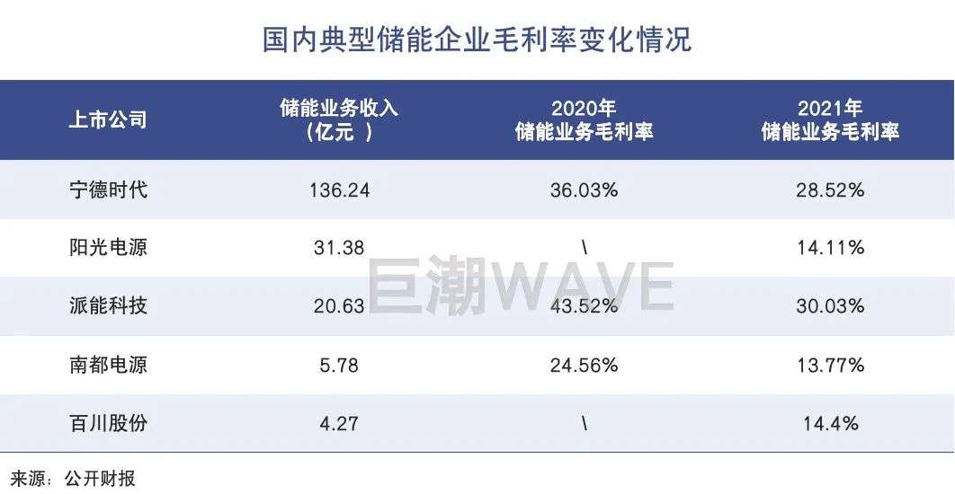 可以看到,具备锂电池生产能力的储能企业,比如宁德时代、派能科技、鹏辉能源、南都电源等,直接受到上游原材料涨价的影响,去年的毛利率普遍出现下滑。