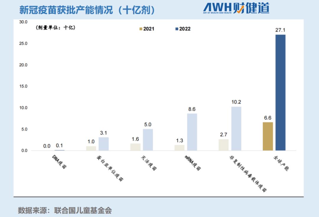 随着越来越多的人完成接种,全球新冠疫苗产能远大于需求。2021年全球新冠疫苗产能仅在66亿剂产能左右,2022年预计将超过27亿剂。