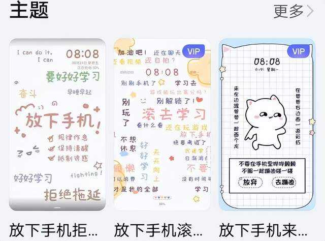 只要打开手机【主题】,搜索框输入【戒掉手机】等关键词,就会出现一堆壁纸,选择你喜欢的一个设置。不过,手机主题壁纸一般比较温和,如果觉得这不足以“鞭挞”自己,你还可以自己设计视觉冲击更强的,语气更为严厉的壁纸。