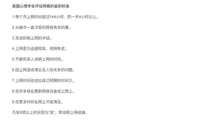 这里有一份来自美国心理学会评估网瘾的鉴别标准,这份标准共列了9项内容,凡是有5项以上的回答为【是】,即说明你已上网成瘾,来看看你中了几项: