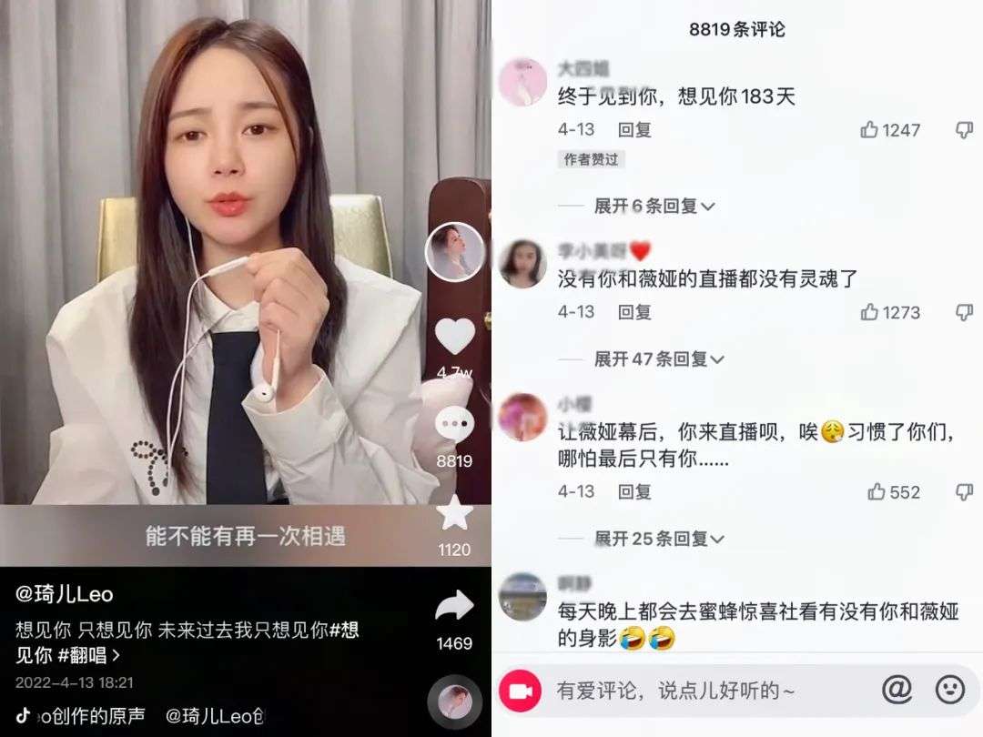 4月13日,琦儿在抖音更新了一条唱歌视频,有粉丝留言表达想念。