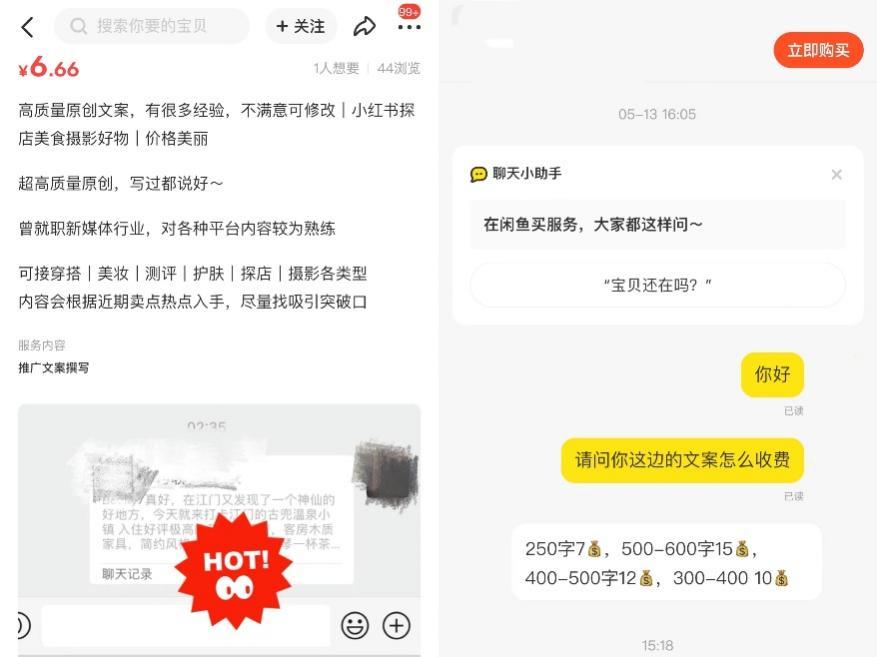 文案功底差?锌刻度在闲鱼上搜索“探店”关键词发现,有人专门做着售卖探店文案的生意。“曾就职新媒体行业,对各种平台内容较为熟练。超高质量原创,写过都说好。可接穿搭、美妆、测评、护肤、探店、摄影各类型,内容会根据近期卖点热点入手,尽量找吸引突破口。”这是该文案师的自我介绍。