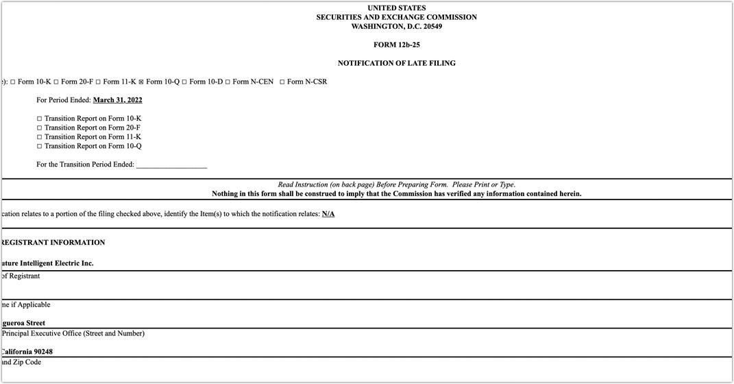 美东时间5月16日,FF汽车发布了关于延迟提交今年第一季度财报的通知,称最迟不晚于5月23日提交2022年第一季度财报。
