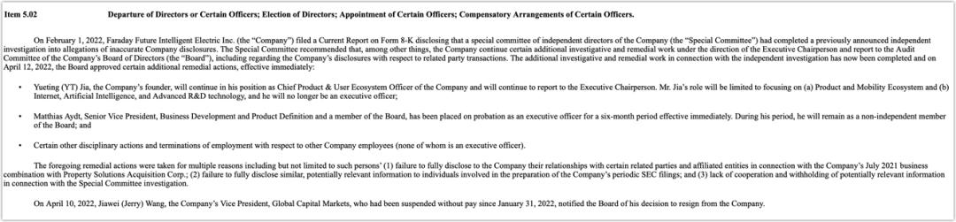 今年2月,法拉第未来公布调查结果,某些公司管理团队成员和员工因涉嫌向投资者发布不准确信息,夸大了其首款量产车型FF 91的预订数量。