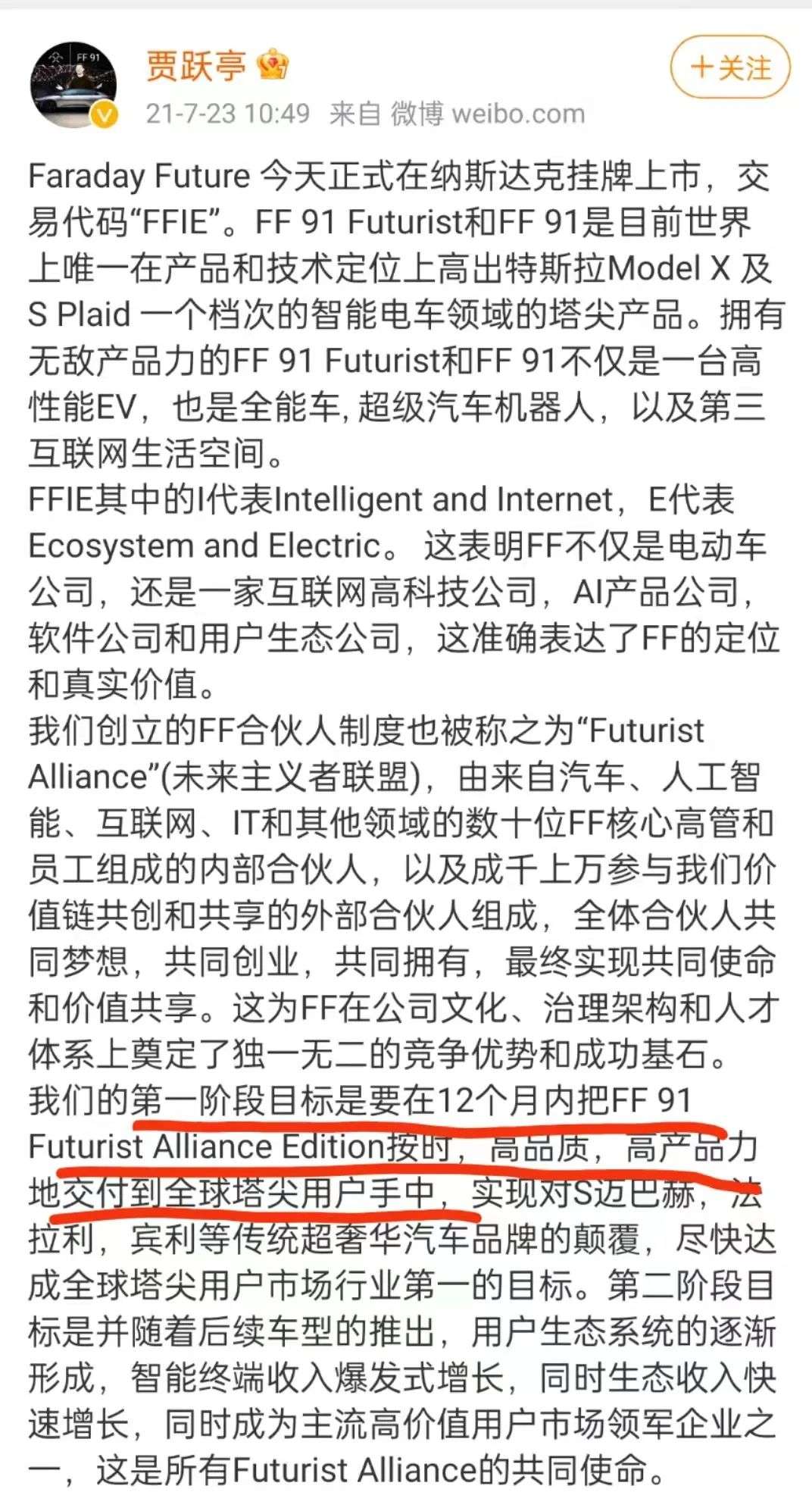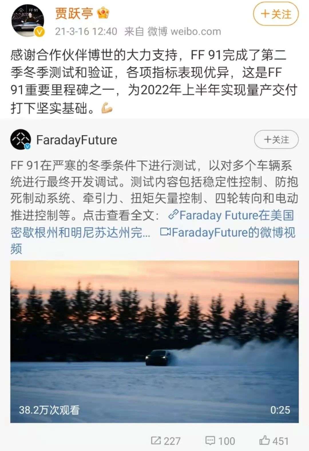 关于这一信息,今年3月,贾跃亭还在微博发文再次坚定时间:“FF91已经完成第二季度的冬季测试和验证,预计2022年上半年实现量产交付。”