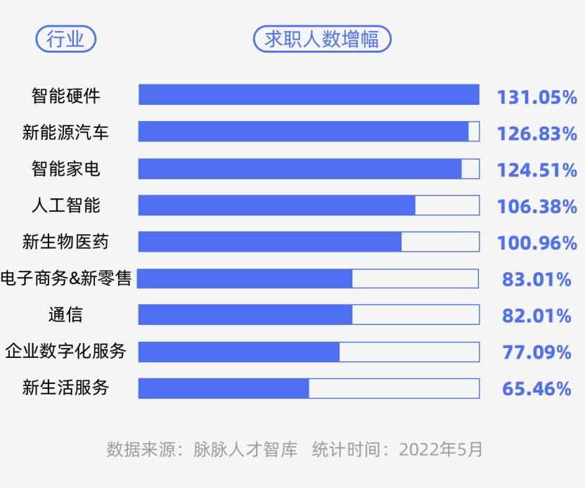 2022第一季度,人工智能行业求职人数相比2021年同比增加106.38%,在所有新经济行业中排名第四。越来越多求职者正在涌入人工智能赛道。