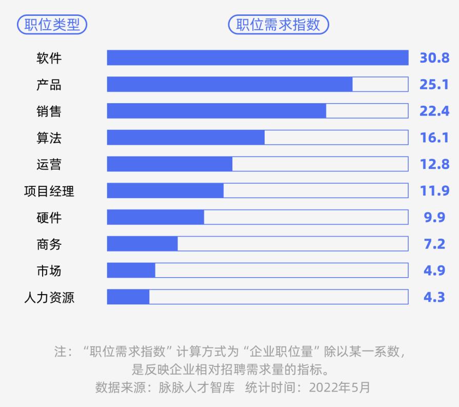 软件相关职位在人工智能行业最急缺,其次是产品、销售、算法和运营。