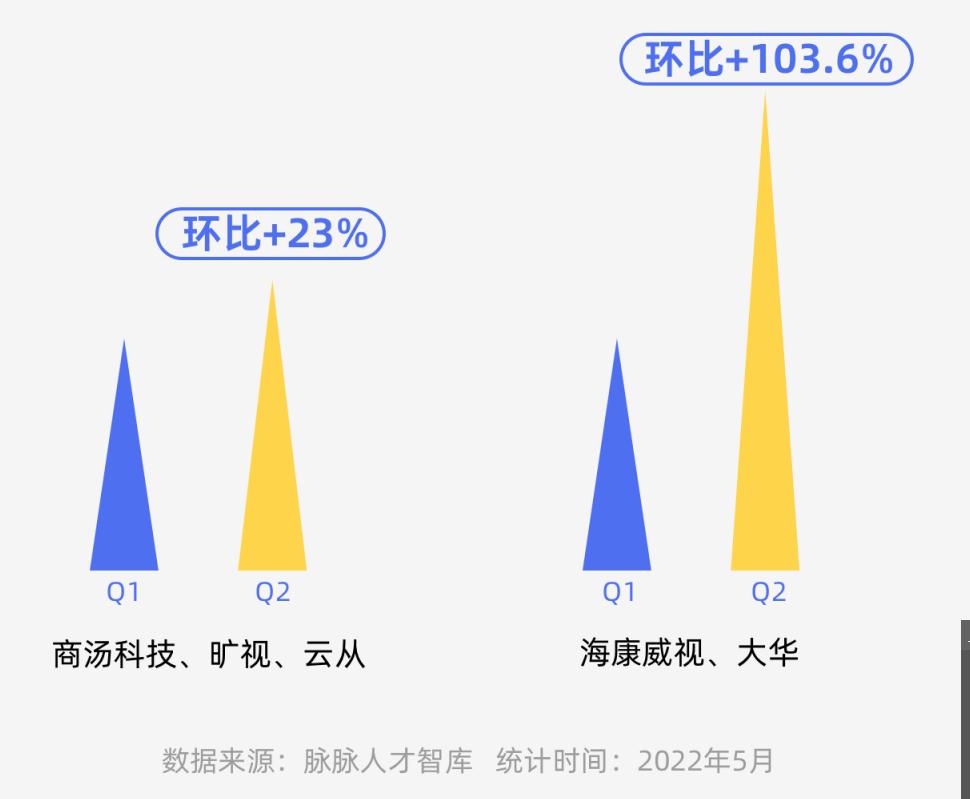 与此相比,人工智能企业呈现出“逆势招聘”趋势。2022年第二季度,人工智能头部企业海康威视和大华的招聘职位总量环比增长了103.6%,“四小龙”中的商汤科技、旷视和云从的职位总量,环比增加了23%。