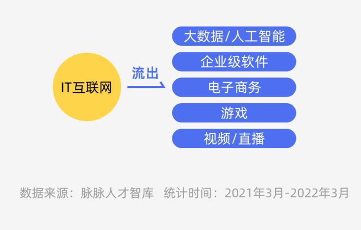 从2021年3月到2022年3月,在新经济领域内,大数据/人工智能行业是互联网流出人才的最大接收方,其次是企业级软件、电子商务、游戏和视频/直播。进入人工智能行业,是互联网人才流动新趋势。