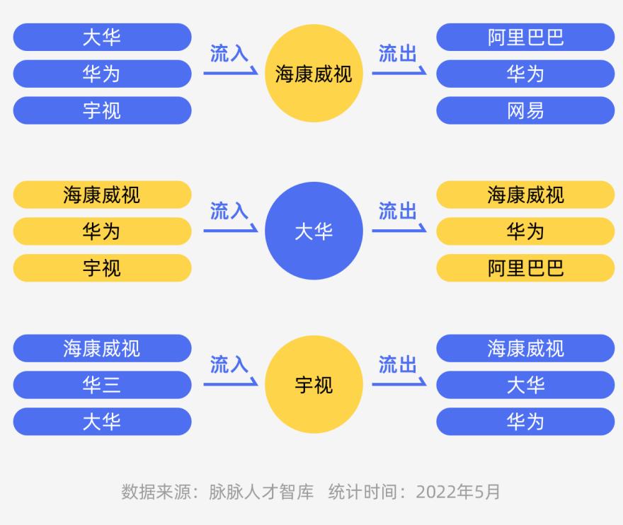作为智能安防领域三大巨头,海康威视、大华和宇视三家企业人才互相流动频繁,对互联网公司人才吸纳较少。海康威视的人才第一来源是大华,而大华和宇视的第一人才来源均为海康威视。