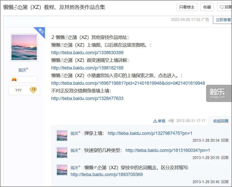 写攻略的玩家们不止于此。2012年,玩家们的讨论从论坛开始慢慢转向贴吧,开启了贴吧的黄金岁月。穿技的研究者之一猪哥,也是在2012年前后从论坛来到了更加大众化的贴吧。猪哥前后写了数十个关于《QQ堂》穿技理论与研究的帖子,从新手入门到各种不同的道具穿、隔空穿、弹穿,猪哥对研究不同的穿技与穿技触发条件十分着迷。