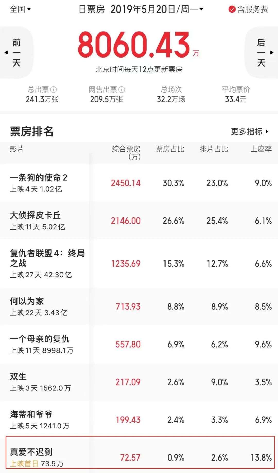 一年之后的2019年5月20日,不巧就赶上了一个星期一。在这一天上映的仅有《真爱不迟到》一部新片,当日票房不足80万元。领跑大盘的《一条狗的使命2》《大侦探皮卡丘》《复仇者联盟4:终局之战》三部影片全部都是引进电影。