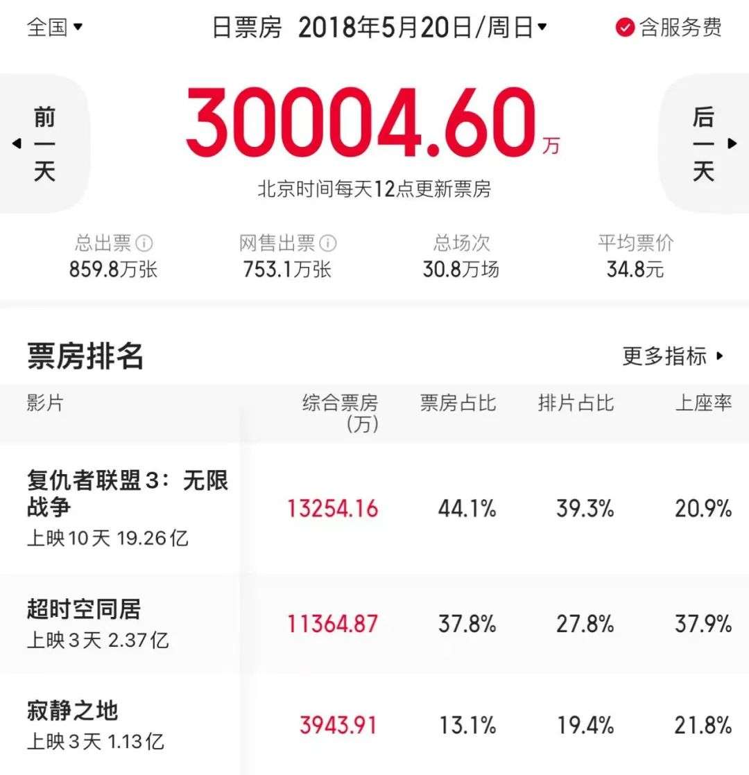 2018年的5月20日,已经上映两天的口碑黑马《超时空同居》热度持续发酵,在该日凭借27.8%的排片占比斩获了37.8%比例的票房,单日票房产出多达1.13亿元,打破了此时正在热映的《复仇者联盟3:无限战争》的垄断地位。这一天尽管是周日,依旧完成漂亮逆跌获得了3亿级别的日大盘体量。