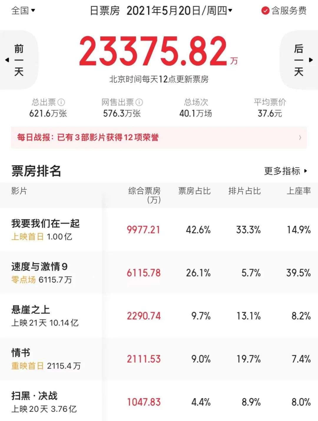 时间来到2021年,这是520档的第二个小高潮。这一年520档有三部新片,其中头号种子《我要我们在一起》依旧是凭借较高的内容品质带动了整个大盘,日票房总量达到了2.3亿元。