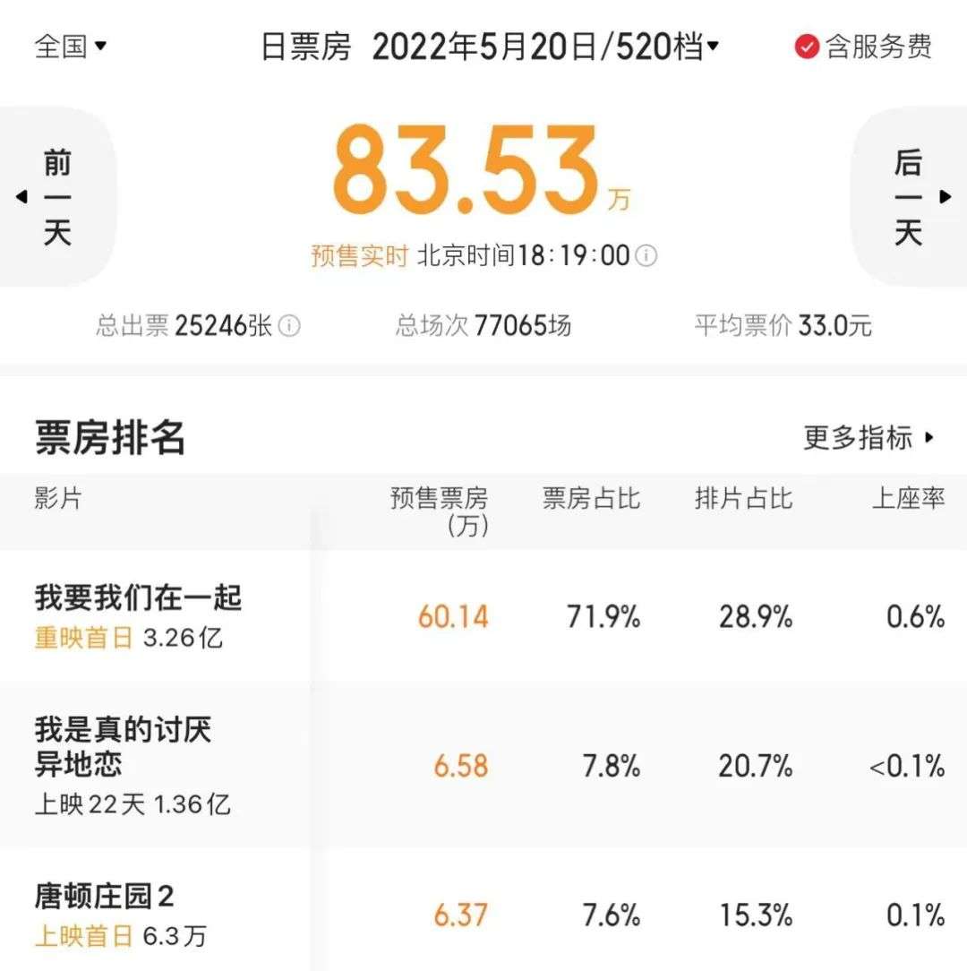 一部是即将重映的去年520档票房冠军《我要我们在一起》。依靠良好口碑基础和档期加成,时隔一年重映,这部影片仍然能够稳居5月20日预售票房的冠军位置。