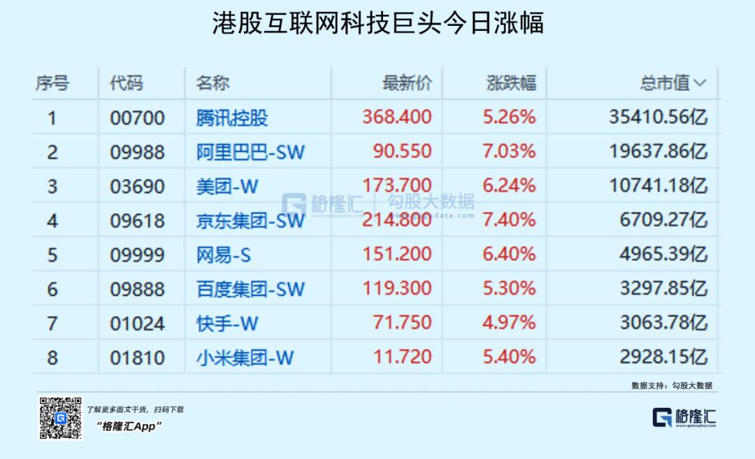 在港股,这种感觉更加强烈。今天港股科技股堪称大爆发,恒指、国指大涨超3%,恒生科技涨了近6%,尤其一众互联网科技巨头,涨幅基本都在5%以上,这种整体暴涨的情况也只有在特殊场景才会出现。