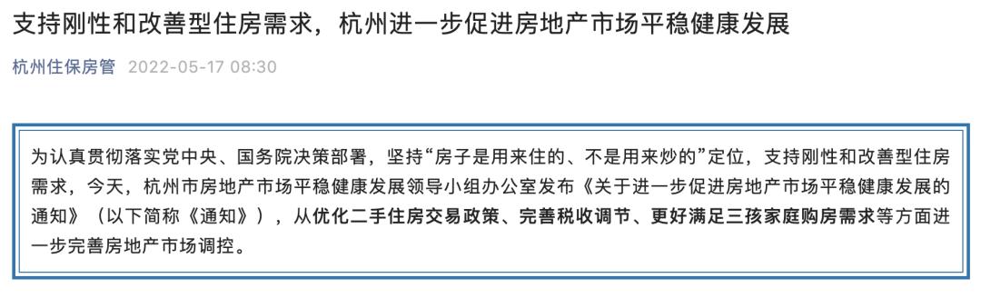 5月17日早间,杭州发布《关于进一步促进房地产市场平稳健康发展的通知》,从二手房交易政策、税收条件、更好满足三孩家庭购房需求等方面优化调控细则。