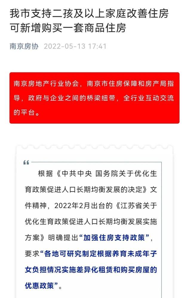 5月13日,据南京房地产业协会消息,为积极推动改善生育二个孩子及以上家庭居住条件,自5月11日起,生育二个孩子及以上南京户籍居民家庭,可新增购买一套商品住房,同时可享受相关银行最优惠贷款利率等支持。