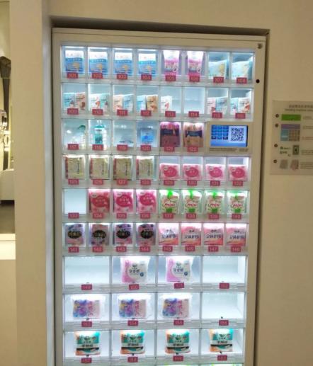 走进厕所,迎面而来的是陈列着纸巾、卫生巾、牙刷牙膏、创可贴等物品的自动贩卖机,安抚了各种突发事件带来的慌乱感。
