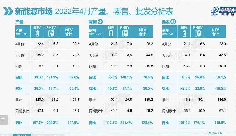 更值得关注的是,国内新能源乘用车市场也在疫情影响下出现增速放缓的情况。乘联会数据显示,4月,国内新能源乘用车批发量为28万辆,同比增长50.1%。崔东树表示,按照此前国内新能源车市走势,4月份如不受疫情影响,新能源乘用车批发销量将达到45万辆。也就是说,受疫情影响,4月国内新能源车批发量较预期减少了17万辆。