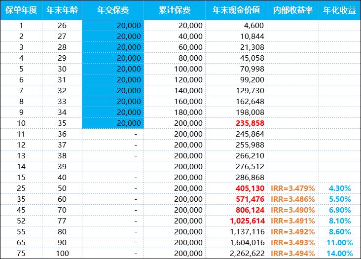 但是你拉长到20年甚至更久,复利3.5%的增额寿平均下来就有年化收益5%以上,最高能到百分之十几,是所有无风险理财里面收益最高的。