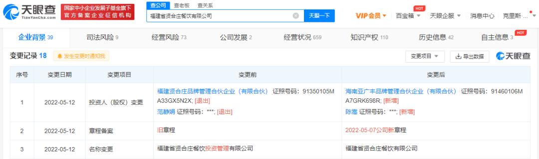 据天眼查数据显示,近日,“福建省贤合庄餐饮投资管理有限公司”改名为“福建省贤合庄餐饮有限公司”, 同时由陈赫担任大股东的“福建贤合庄品牌管理合伙企业(有限合伙)”已退出股东行列。