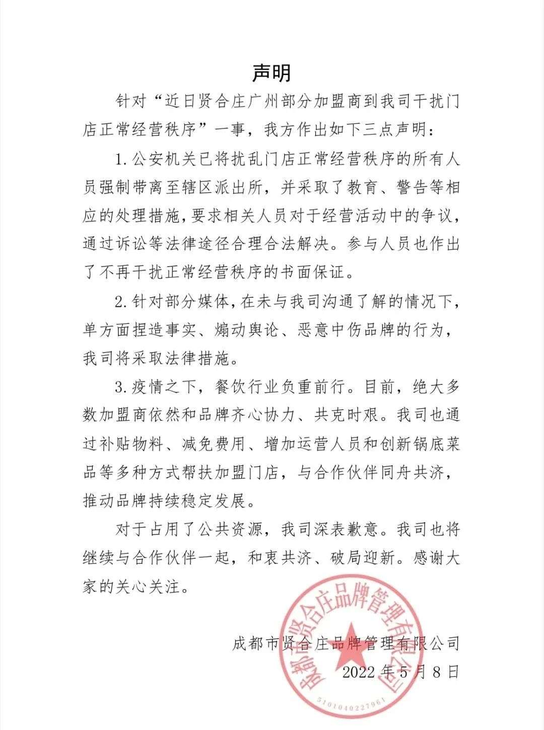 事情经过媒体曝光后,贤合庄官方也在社交平台上发表声明做出回复,将此事定义为“部分加盟商到我司干扰正常经营秩序”。