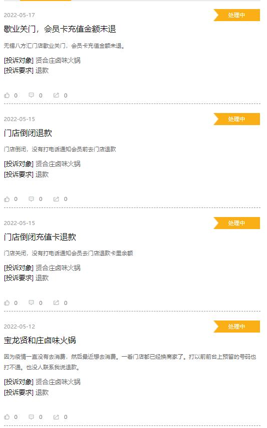 而随着关店率的上升,更带来了一些不良的连锁反应,也在在黑猫投诉平台上,关于贤合庄的投诉超过100条,其中很多都是反映门店倒闭后,充值卡金额无法退还。