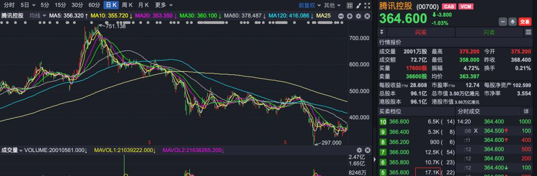然而,让许多投资者尴尬和不解的是,拥有微信的腾讯控股,其股价在过去一年多以来跌得有些惨不忍睹。去年2月,腾讯股价最高700多港元,今年3月份最低跌破300港元,而现在依然只有360多港元,相对于历史高点跌了一半多。