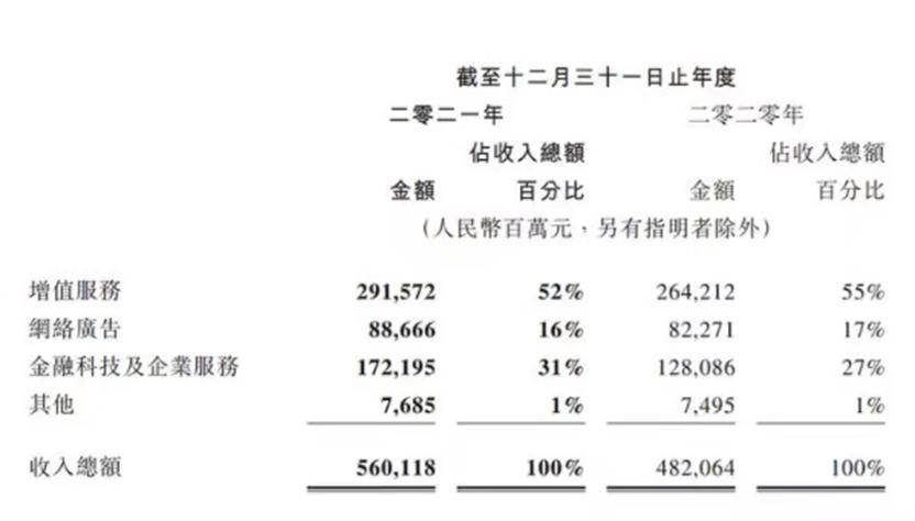 其实是因为,腾讯不仅仅有微信,还有很多收入来源,比如广告、游戏、金融科技等等。根据腾讯公布的2021年年报,公司去年收入5601亿元,按照报表,业务分为三块: