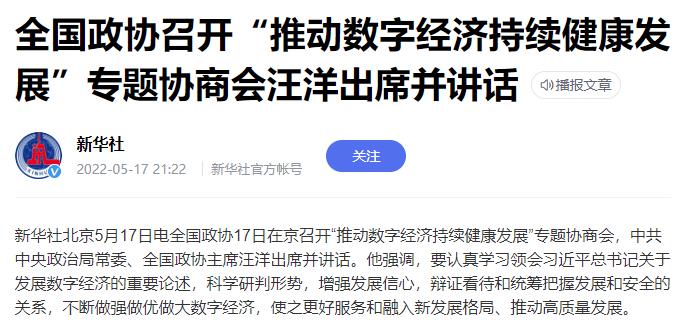 据报道,全国政协17日在京召开“推动数字经济持续健康发展”专题协商会。中共中央政治局委员、国务院副总理刘鹤出席会议并讲话。他指出,全球数字经济正呈现智能化、量子化、跨界融合等新特征。要努力适应数字经济带来的全方位变革,打好关键核心技术攻坚战,支持平台经济、民营经济持续健康发展,处理好政府和市场关系,支持数字企业在国内外资本市场上市,以开放促竞争,以竞争促创新。