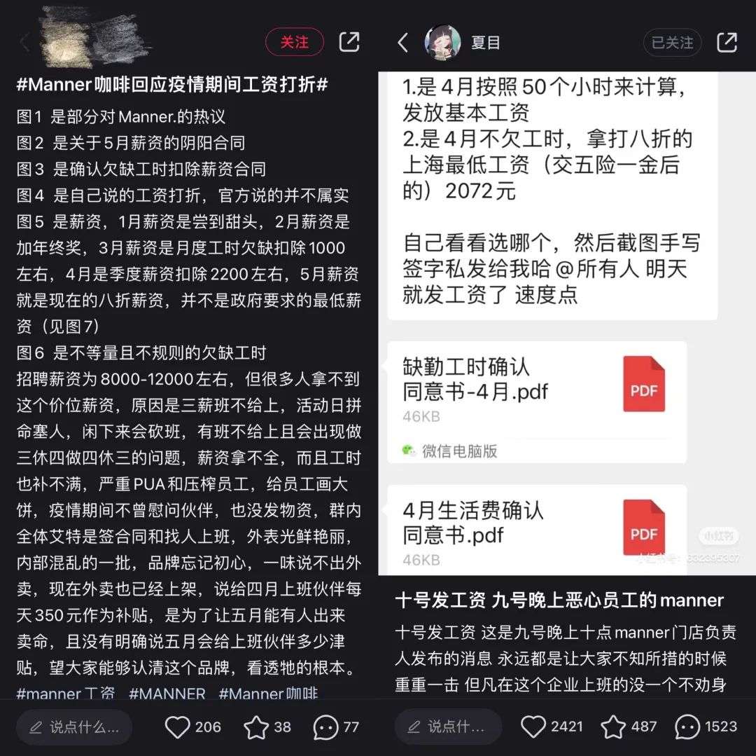 值得注意的是,在“疫情员工工资打折”事件发酵的一周,“夏目”的帖子依然挂在小红书平台上,有部分员工开始删文、注销账号,也有部分员工开始匿名发文并在社交媒体上发言,矛头更是直指Manner管理以及排班上的一系列问题。