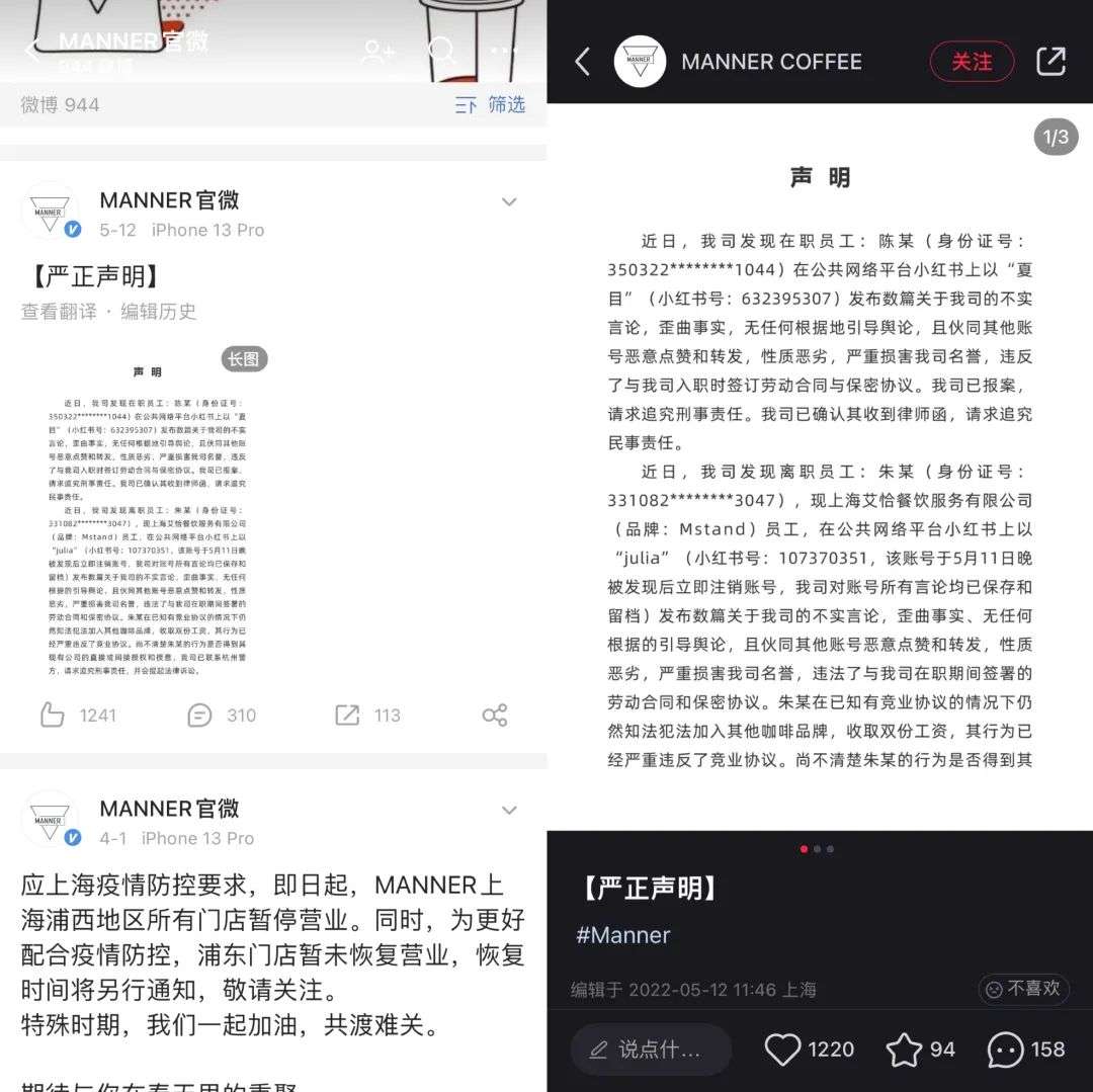5月10日,两位Manner咖啡在职员工和一位离职员工通过小红书平台“爆料”Manner咖啡4月工资问题,随即引爆了网络上对Manner“讨伐”的导火索。随后,Manner也不甘示弱,分别在微博及小红书平台发文回应,针对不实信息发布,要追究员工刑事责任和民事责任。