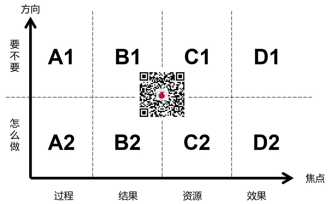 如果我们把思考的焦点作为横轴,把思考的方向作为纵轴,然后对它们进行细化,把四种不同的思考焦点 - 过程、结果、资源和效果,分别设为A、B、C、D;把两种不同的思考方向 - 要不要和怎么做,分别设为1、2。
