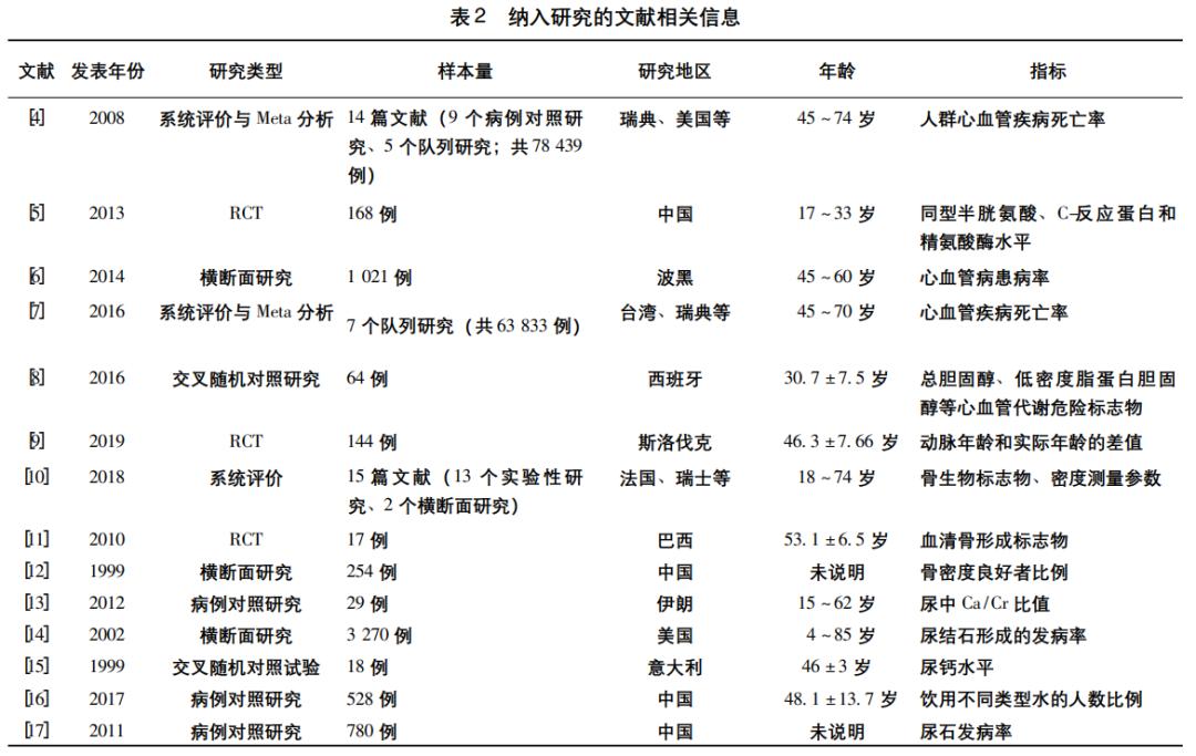 其中,在饮用水与心血管健康的研究方面,2008 年一项纳入了25 项研究的 Meta 分析结果显示,饮用水中镁含量与人群心血管疾病死亡率呈显著负相关[11];一项 2016 年的 Meta 分析发现,饮用水中镁和钙的含量对人群心血管疾病可能存在适度保护作用[12]。