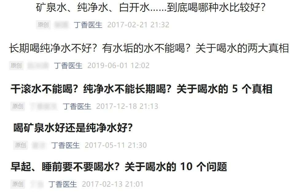 2017年2月21日,丁香医生公众号首发《矿泉水、纯净水、白开水……到底喝哪种水比较好?》[1][2],截止目前,丁香医生发表涉及饮用水的文章已达20余篇(部分是重复发布)。文章的主要结论是:各种水没有区别,喝水补充的只是水,喝一瓶矿泉水补充的矿物质,还不如吃口蔬菜喝口奶补充的更多。