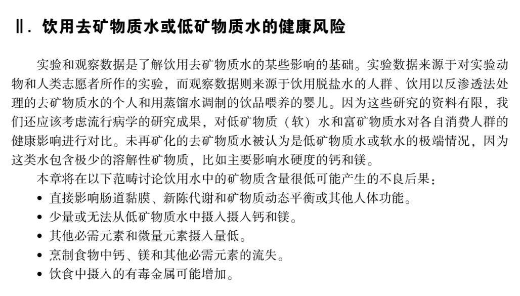 不少专家已经在质疑家庭净化水、包装纯净水的“0矿物元素”风险。华西妇女儿童医院原院长毛萌教授曾直言:水中的矿物元素虽少,但吸收率远高于固体食物,实际占到了人体每日所需的30%以上,并非很多人以为的“微乎其微”。此外,世界卫生组织在《饮用水水质准则》和《饮用水中的营养素》(2005年颁布,Nutrients in Drinking Water)中也提到,水中的矿物质元素可补充膳食矿物元素摄入,饮用水中的钙、镁的摄入量为成人总摄入量的5%-20%,在心血管疾病方面对人体存在一定保护。